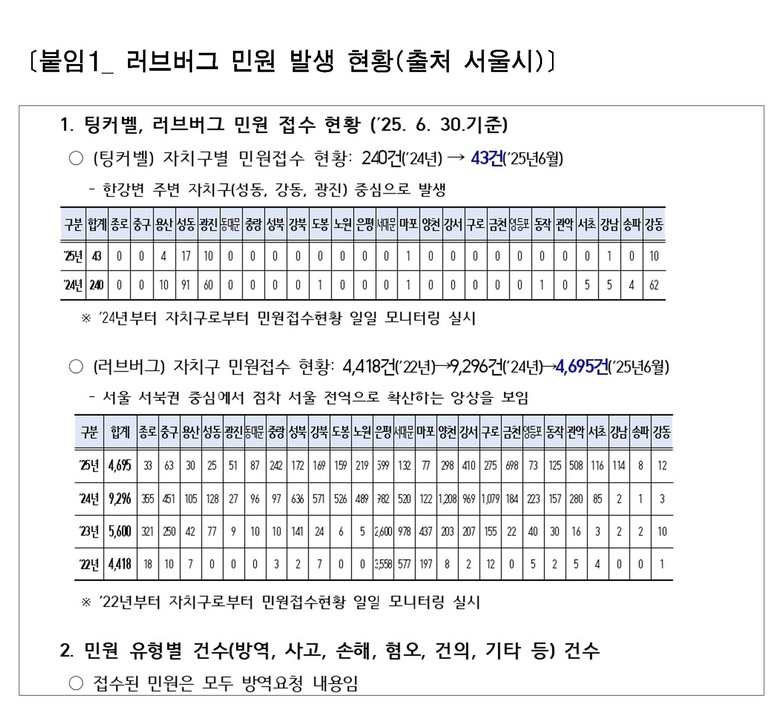 서울시의회 윤영희 의원(국민의힘, 비례대표)이 서울시로부터 제출받은 자료에 따르면, 러브버그 방제 민원은 2022년 4,418건, 2023년 5,600건, 2024년 9,296건으로 해마다 급증했으며, 2025년에는 상반기만에 이미 4,695건이 접수되었다. 모든 민원은 방역 요청이며, 그 수치는 러브버그에 대한 시민의 우려와 방제 요구가 단순한 환경 논쟁을 넘어 생활 안전 차원으로 번지고 있음을 방증한다. [*붙임1 참고]