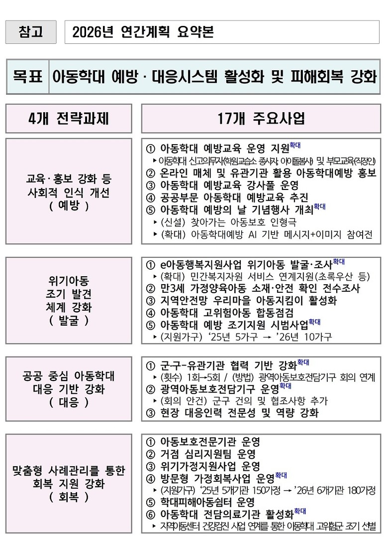 이번 연간계획은 ▲교육·홍보 강화를 통한 사회적 인식 개선(예방) ▲위기아동 조기 발견 체계 강화(발굴) ▲공공 중심의 아동학대 대응 기반 강화(대응) ▲맞춤형 사례관리를 통한 회복 지원 강화(회복) 등 4대 추진전략을 중심으로, 총 19개 주요 사업을 추진하는 것이 핵심이다.