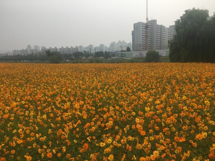 [대전=세계타임즈 이장성 기자] 전형적인 가을 날씨를 보인 대전천변에 대전시 하천관리사업소에서 재배한황화코스모스가 활짝 피어 가을의 정취를 물씬 풍기고 있다.