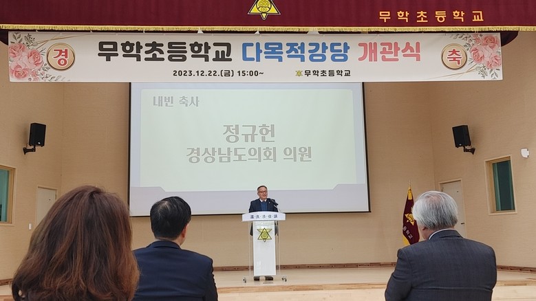 [경남 세계타임즈=최성룡 기자] 경상남도의회 교육위원회 정규헌(창원9·국민의힘) 의원이 22일 무학초등학교 다목적 강당 개관식에 참석해 개관을 축하했다.