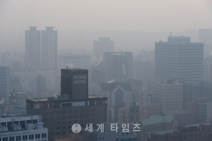 전국적으로 미세먼지 농도가 나쁨 상태를 보이고 있는 19일 오전 서울 중구 롯데호텔에서 바라본 도심이 뿌옇다. 2017.01.19.