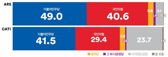 [세계타임즈 = 심귀영 기자] 여론조사 꽃이 6월 9일부터 10일까지 양일간 실시한 6월 2주차 ARS 정당 지지율 조사에서 더불어민주당은 지난주 대비 3.2%p 내린 49.0%, 국민의힘은 4.0%p 오른 40.6%로 집계되어 양당 지지율 격차는 다시 8.4%p로 좁혀졌다.(표집: 진보 23.5% / 중도 43.8% / 보수 23.2%)지역별로는 강원·제주지역의 미미한 동반 하락을 제외하고 대전·세종·충청, 대구·경북지역은 더불어민주당 상승, 그 외의 지역은 국민의힘이 상승했다.