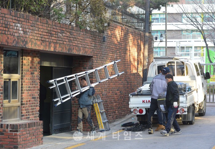 14일 오전 서울 삼성동 박 전 대통령 사저로 전기설비 등 시설 작업 근로자들이 장비를 들고 들어서고 있다. 2017.03.14.