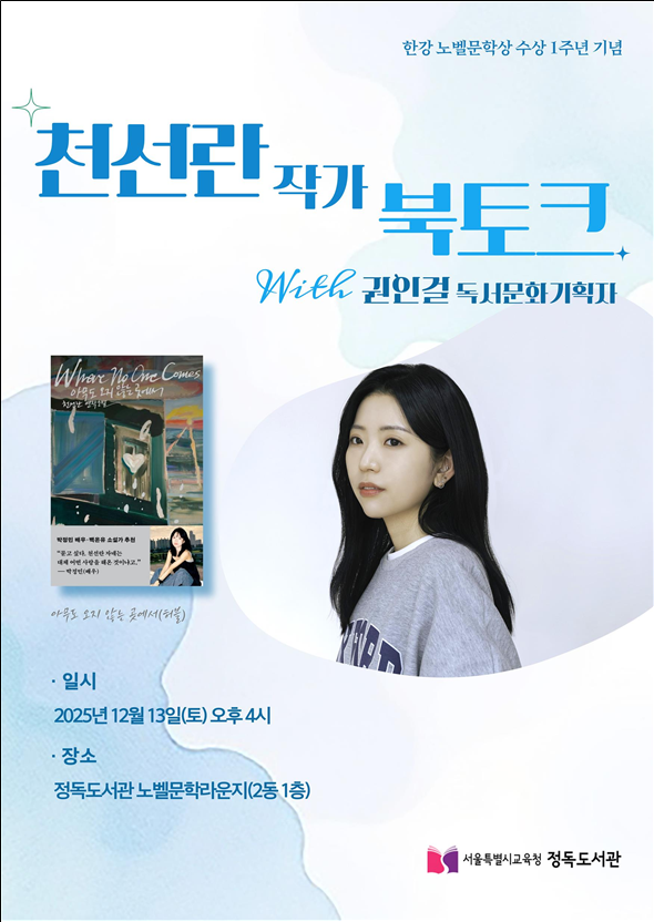 김애란, 천선란, 이창용 작가와 함께하는 북토크 [서울 세계타임즈=이장성 기자] 서울특별시교육청(교육감 정근식) 산하 정독도서관(관장 엄동환)은 한강 작가의 노벨문학상 수상 1주년을 기념하여, 오는 12월 「노벨문학라운지 북토크」를 개최한다. 이번 행사는 한국문학을 대표하는 작가와 시민이 한 공간에서 작품 세계를 깊이 탐구하고 문학적 감정과 사유를 공유할 수 있도록 마련되었다.