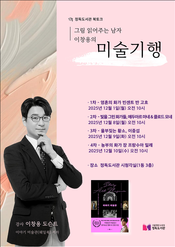 정독도서관은 예술과 인문학의 융합 경험을 확대하기 위해, 이창용 도슨트가 진행하는 ‘이야기 미술관’ 북토크도 12월 1일·8일·9일·10일(총 4회) 시청각실에서 별도로 운영한다. 고흐·마네와 모네·이중섭·밀레 등 명화와 예술가들의 삶을 통해 감상·사유·창조의 감각을 확장하는 프로그램이다.