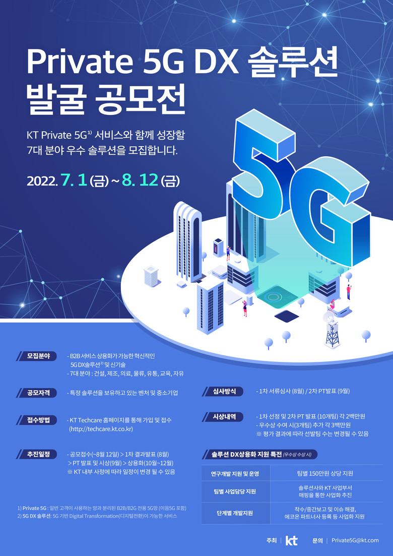KT의 프라이빗 5G는 일반 고객(B2C)이 사용하는 망과 분리된 별도의 B2B 전용망으로 기업전용5G와 이음5G를 통용하는 서비스다. 솔루션 공모 분야는 건설, 제조, 의료, 물류, 유통, 자유 7개 분야며, 자체 솔루션을 보유한 기업이면 KT Techcare 홈페이지를 통해 공모에 참여할 수 있다.