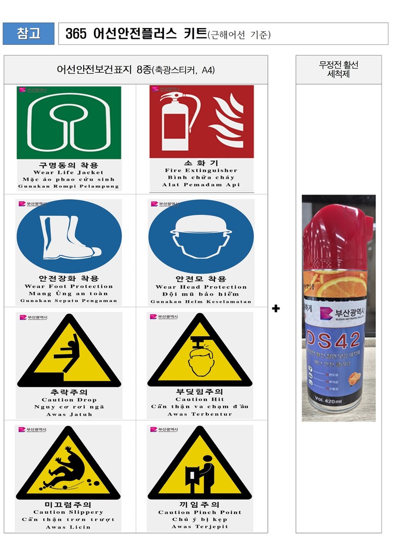'365 어선안전플러스 키트'에는 외국어(영어·베트남어·인도네시아어)가 병기된 축광 어선안전보건표지와 무정전 활선 세척제가 담겼으며, 작업 중 안전사고를 예방하고 화재위험 요소를 사전에 차단하는 것을 목표로 제작됐다. 부산시 선적 어선 중에 수요조사서를 제출한 근해 및 연안 어선 2천364척에 전달된다.