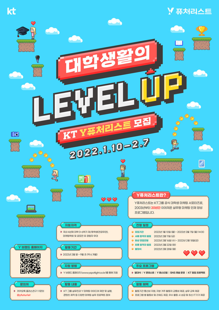 [세계타임즈 이영진 기자]KT는 2022년도에 활동할 ‘Y퓨처리스트’를 2월 7일까지 모집한다고 11일 밝혔다. Y퓨처리스트는 2003년에 ‘모바일퓨처리스트’ 1기로 시작돼 올해 20년차를 맞는 KT그룹의 대학생 마케팅 서포터즈 프로그램이다. 지난 19년간 약 4,720명의 대학생이 Y퓨처리스트 활동에 참여했다.