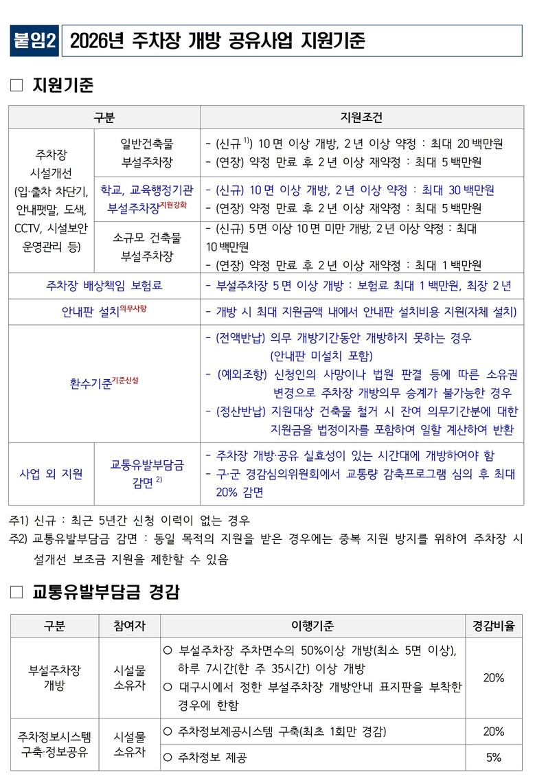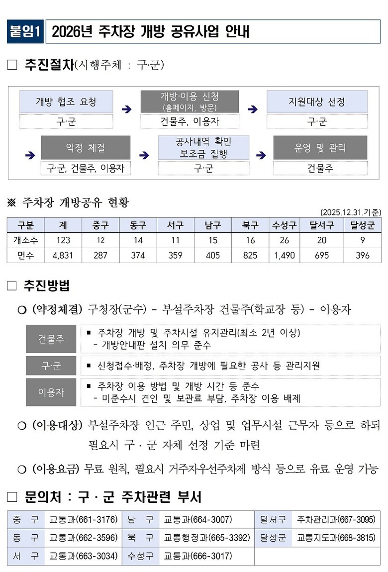 ▸ 학교·민간시설 부설주차장 개방 시 시설개선비 최대 3천만원 지원 [대구 세계타임즈=한윤석 기자] 대구광역시는 도심 및 주택가의 만성적인 주차난 해소를 위해 교회·학교 등 민간 및 공공시설의 부설주차장을 주민에게 개방·공유하는 ‘주차장 개방 공유사업’을 2026년에도 지속 추진한다.