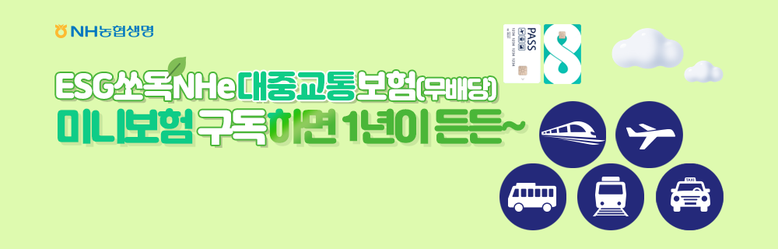 ‘ESG쏘옥NHe대중교통보험’은 버스·지하철·택시·기차·비행기 사고는 물론, 정류장 대기 중 사고도 보장한다. 대중교통 이용 중 교통사고로 사망 시 2천만원, 승용차·오토바이·자전거 등 교통사고로 사망 시 5백만원의 사망보험금을 지급한다.