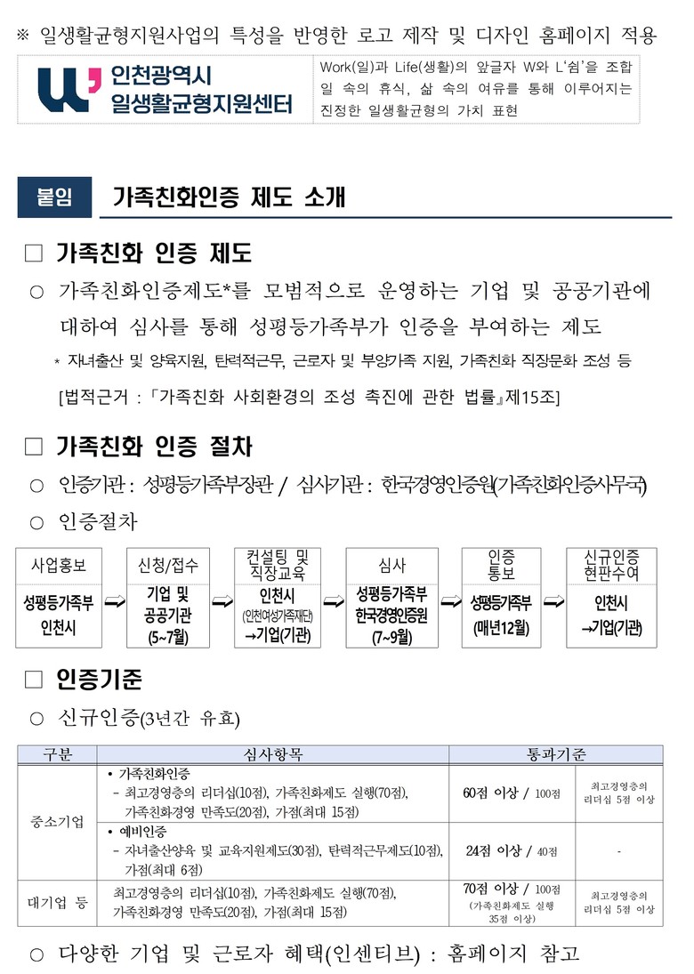 홈페이지에는 인천시가 추진하는 일·생활균형 정책과 센터에서 운영 중인 주요 사업 내용(가족친화인증, 워라밸 실천 콘텐츠 등)이 담겨 있으며, 시민과 기업은 이를 통해 사업 정보를 확인하고 온라인으로 편리하게 신청하고 참여할 수 있다.