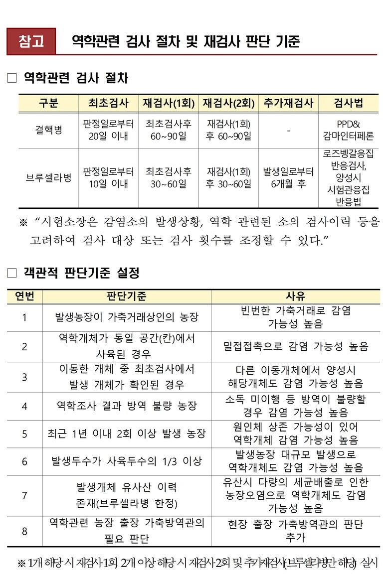 이번 조치는 「결핵병 및 브루셀라병 방역실시요령」 제7조 및 제12조 제3항에 따라 동물위생시험소장의 검사 조정 권한을 현장에 적용할 수 있도록 기준을 명확히 정리한 것이다.