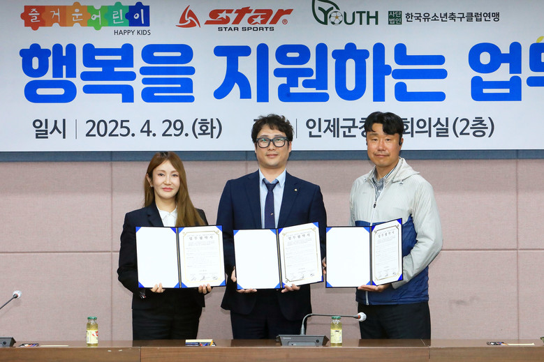 한편, 즐거운 어린이는 인제군 지역발전 및 관내 청소년 지원 활성화를 위해 최근 신신상사(주)스타스포츠, 사단법인 한국유소년축구클럽 연맹과 최근 인제군청 소회의실에서 업무협약을 체결했다.