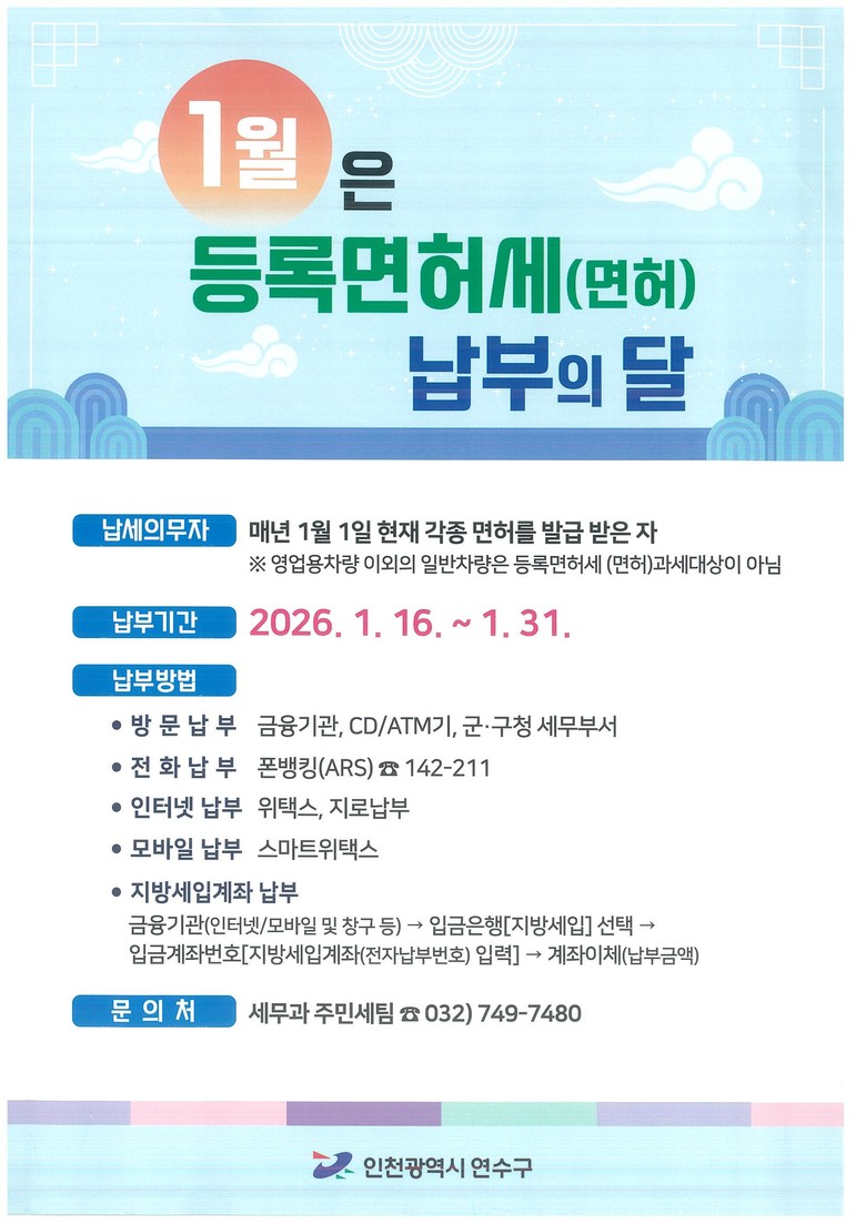 등록면허세(면허) 관련 기타 자세한 사항은 세무과 주민세팀(☎032-749-7480)에 문의하면 된다.