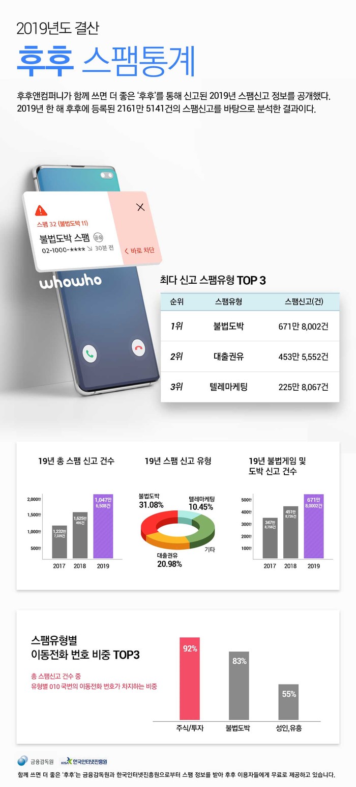 [세계타임즈 이영진 기자]후후앤컴퍼니가 스팸차단 앱 ‘후후’를 통해 2019년 한해 동안 이용자들이 신고한 스팸 건수 통계를 공개했다.