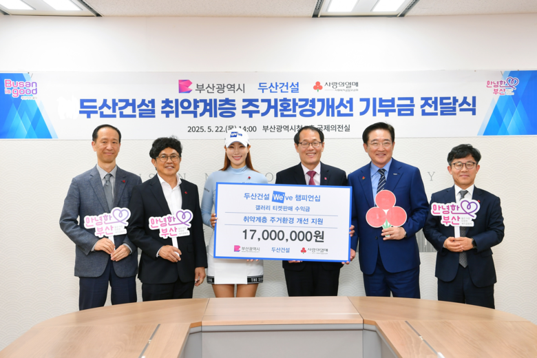 전달식에서 두산건설은 '2025 두산건설 위브(We've) 챔피언십' 골프대회 입장료 수익금과 선수 팬 상품(굿즈) 티셔츠 판매 수익금으로 조성한 기금 1천7백만 원을 부산지역 취약계층 주거환경개선을 위해 기부했다.