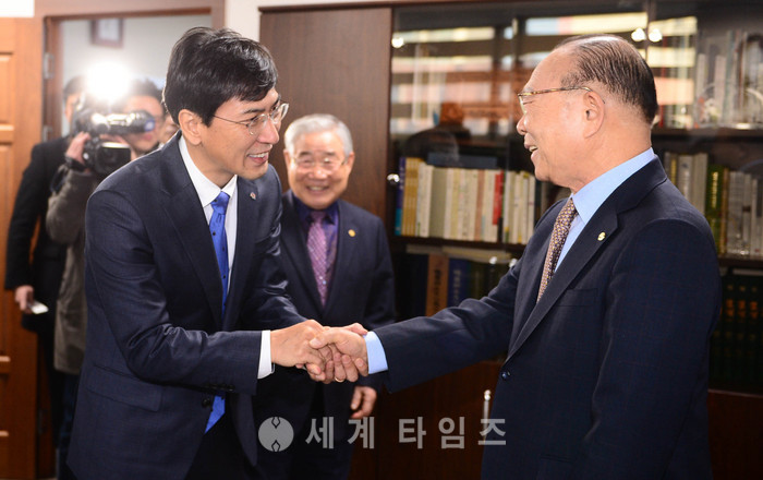 안희정 충남지사가 9일 오전 서울 용산구 대한노인회 중앙회를 방문해 이심(오른쪽) 중앙회장과 인사를 하고 있다.