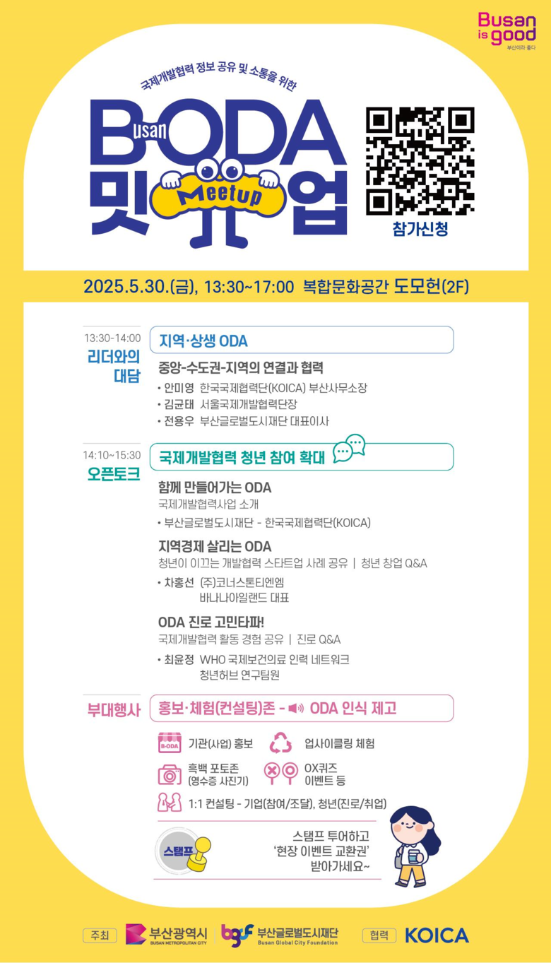◈ ▲오픈 강연 ▲오픈 토크 ▲부대행사 등 다채로운 프로그램 운영… 부산 청년과 기업들의 국제개발협력 참여 활성화 기대 [부산 세계타임즈=이용우 기자] 부산시(시장 박형준)와 부산글로벌도시재단(대표 전용우)은 한국국제협력단(KOICA) 부산사무소와 협력해 오늘(30일) 오후 1시 30분 복합문화공간 도모헌 2층에서 「제3회 비-오디에이(B-ODA)* 밋업 데이(이하 행사)」를 개최한다고 밝혔다.