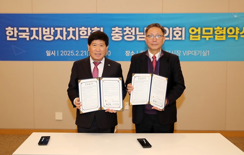 [충남 세계타임즈=이현진 기자] 충남도의회(의장 홍성현)는 지방자치 관련 전문 학회와의 교류 증진을 통해 의회 발전을 도모하고자 21일 경기도 일산 킨텍스에서 열린 사단법인 한국지방자치학회(회장 임정빈)와 업무협약을 체결하고, 상호 협력체계를 구축하기로 했다.