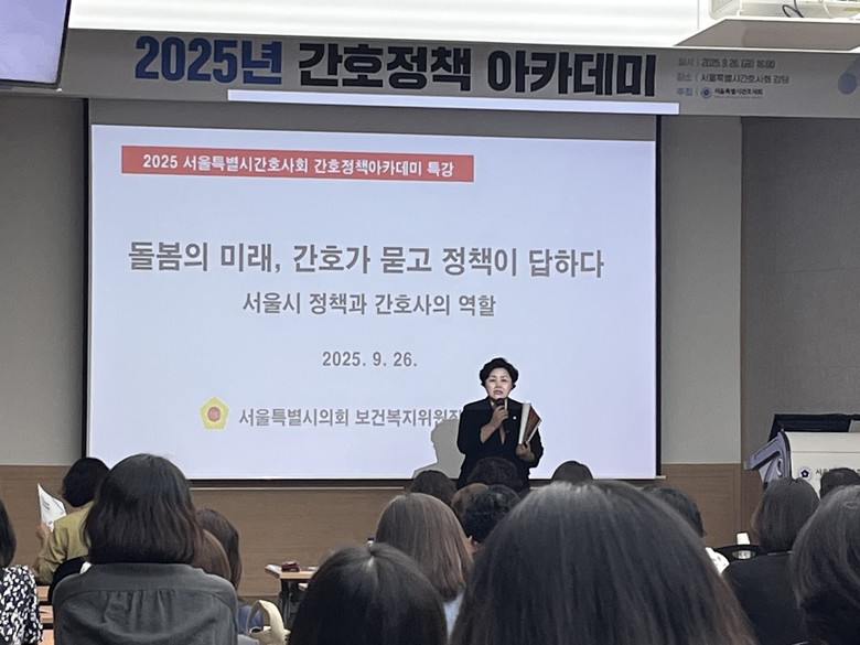 [서울 세계타임즈=이장성 기자] 서울특별시의회 보건복지위원회 김영옥 위원장(국민의힘, 광진3)은 9월 26일(금) 서울특별시간호사회(회장 박정선) 5층 강당에서 열린 서울특별시간호사회 「2025 간호정책 아카데미」에서 ‘돌봄의 미래, 간호가 묻고 정책이 답하다’라는 주제로 특강을 진행했다.