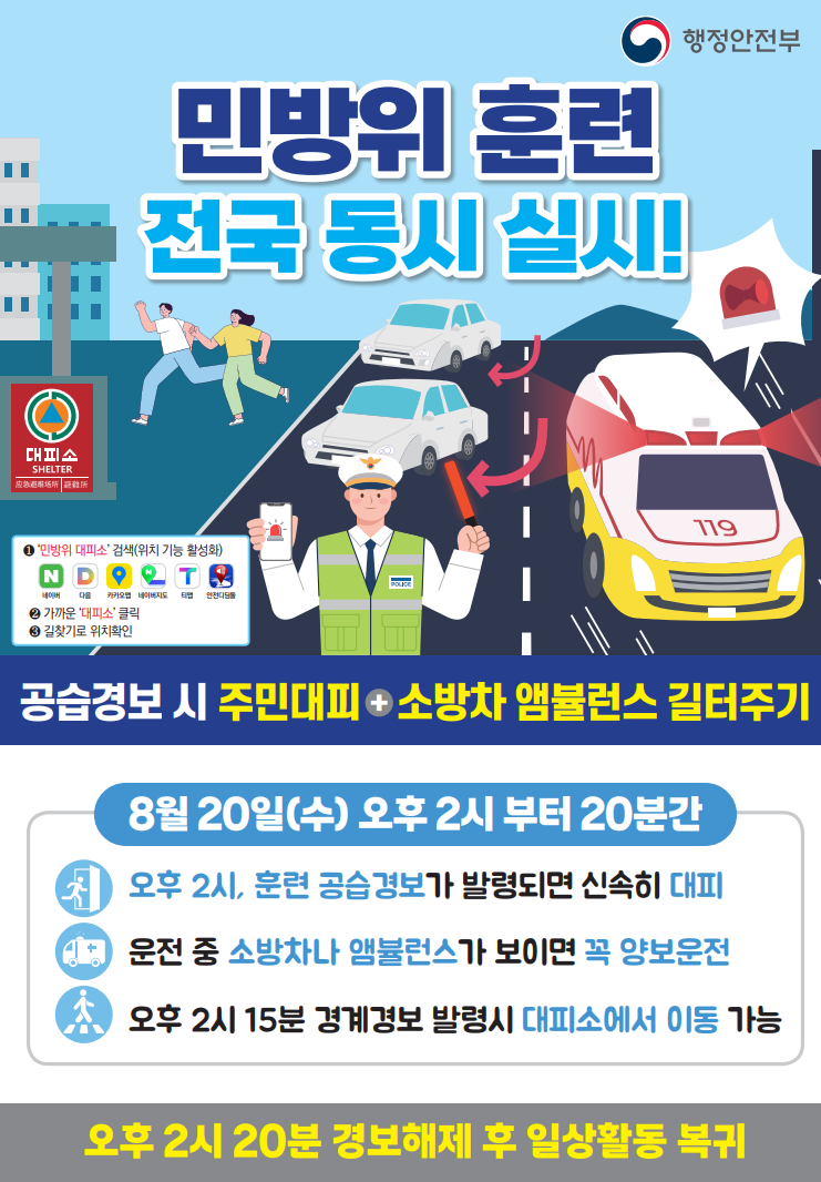 특히, 을지연습 3일 차인 8월 20일 오후 2시에 실시하는 공습 상황 대비 민방위훈련은 별도 차량 이동 통제 없이 진행될 예정이며, 같은 시각 부산시 12개 소방서에서는 소방차·구급차 ‘길 터주기 훈련’이 실시되므로 시민들의 적극적인 협조가 필요하다.