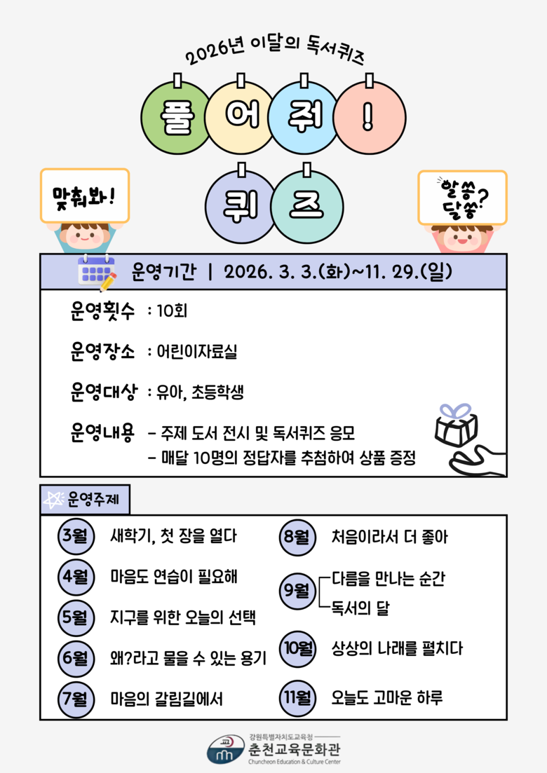 이달의 독서퀴즈 ‘풀어줘! 퀴즈’는 월별 주제에 맞춘 도서를 전시하고, 해당 도서를 읽은 뒤 독서퀴즈에 참여하는 어린이 대상 독서진흥 프로그램으로, △3월 ‘새학기, 첫 장을 열다’ △4월 ‘마음도 연습이 필요해’ △5월 ‘지구를 위한 오늘의 선택’ △6월 ‘왜?라고 물을 수 있는 용기’ △7월 ‘마음의 갈림길에서’ △8월 ‘처음이라서 더 좋아’ △9월 ‘다름을 만나는 순간’, ‘독서의 달’ △10월 ‘상상의 나래를 펼치다’ △11월 ‘오늘도 고마운 하루’로 총 10회 운영한다.