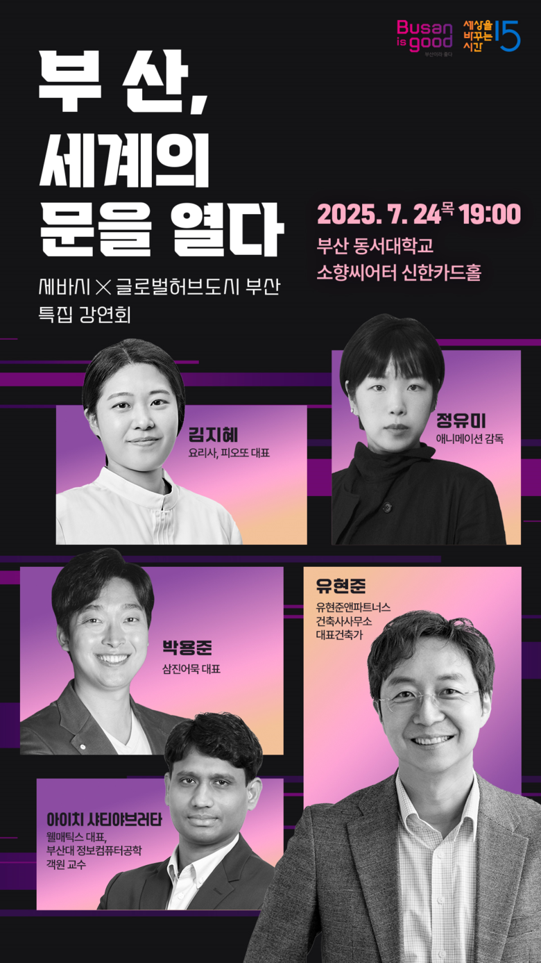 ◈ 글로벌 허브도시 부산이 추구하는 '연결과 성장'의 메시지를, 다양한 스토리와 경험을 통해 시민들과 공유할 예정 [부산 세계타임즈=이용우 기자] 부산시(시장 박형준)는 '세상을 바꾸는 시간 15분(이하 세바시)'과 함께 오는 7월 24일 동서대학교 소향씨어터 신한카드홀에서 「부산, 세계의 문을 열다」를 주제로 글로벌 허브도시 특집 공개 강연회를 개최한다고 밝혔다.