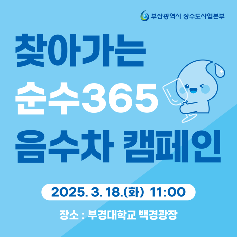 캠페인에 대한 자세한 내용은 본부 공식 인스타그램(@soonsoo_365)에서 확인할 수 있으며, 기타 문의 사항은 시 상수도사업본부 총무팀(☎ 051-669-4215)으로 전화 문의하면 된다.