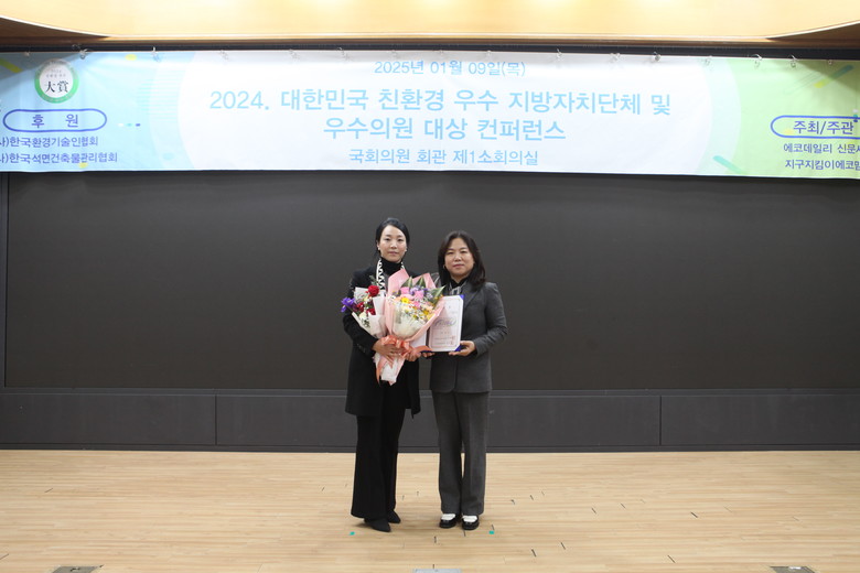 육 의원은 “23년에 이어 24년에도 친환경 우수의원으로 선정돼 기쁘다”며 “앞으로도 주민과 환경을 위한 지속 가능한 정책을 발굴하고, 지역사회의 발전에 기여하는 의정활동을 이어가겠다”고 소감을 밝혔다.