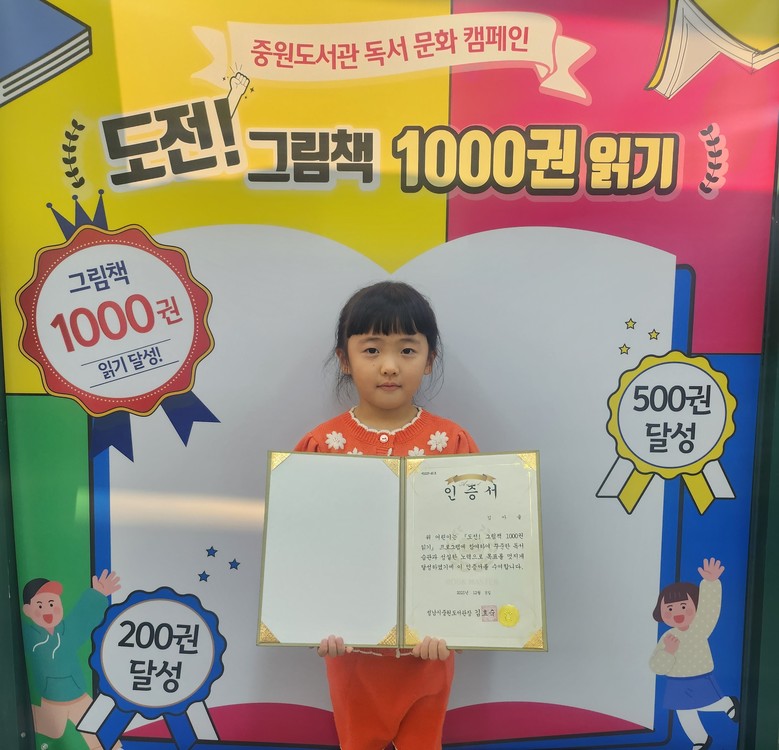 | ▲중원도서관 독서권장 프로그램에 참여한 어린이가 인증서를 받고 기념 촬영을 하고 있다.(사진=성남도시개발공사) |