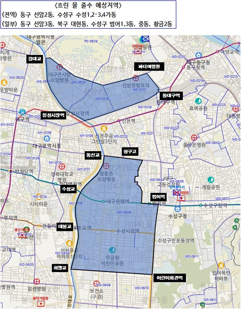 ▸ 6월 25일(수) 22시부터 다음날 06시까지 동구, 북구 및 수성구 일부 지역 흐린 물 출수 예상