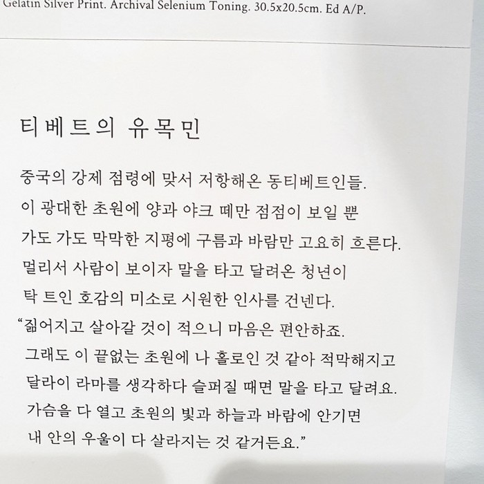 "짊어지고 살아갈 것이 적으니 마음은 편안하죠. 그래도 이 끝없는 초원에 나 홀로인 것 같아 적막해지고 달라이 라마를 생각하다 슬퍼질 때면 말을 타고 달려요. 가슴을 다 열고 초원의 빛과 하늘과 바람에 안기면 내 안의 우울이 다 살라지는 것 같거든요."