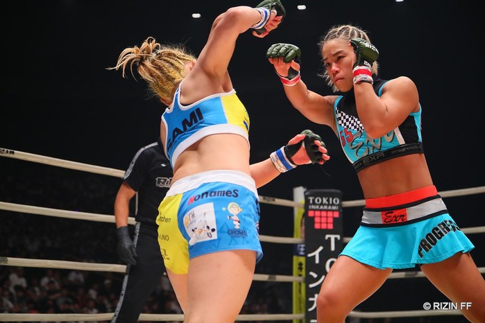 [세계타임즈 김인수기자] 함서희는 28일 일본 도쿄 사이타마 슈퍼아레나에서 열린 RIZIN FF 17 대회에 출전, 일본의 마에사와 토모(32)를 1라운드 3분 14초 만에 니킥에 의한 TKO로 제압했다.