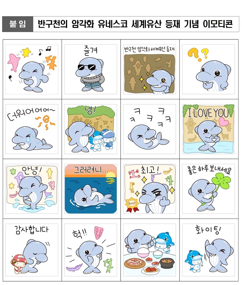 이모티콘은 울산의 자연과 문화유산을 친근하게 디자인해 ‘반구천의 암각화’의 역사적 가치를 알리고 울산을 홍보할 수 있도록 제작됐다.