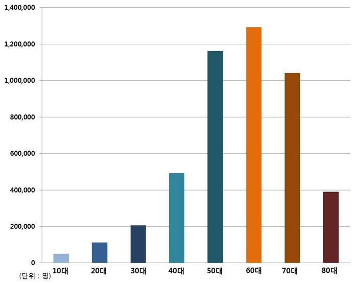 | ▲ 2016년 연령대별 관절염 환자 수 |