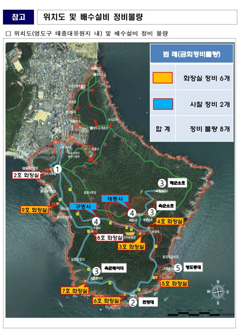 이번 사업은 총사업비 40억 원을 투입해 태종대유원지 내부 순환도로에 약3.1킬로미터(km)의 오수관로를 신설하고, 각 화장실의 발생하는 오수를 신설 오수관로로 직접 연결하여 영도하수처리장으로 처리하는 방식이다. 공사는 영도구청(도시안전과) 주관으로 오는 4월 착공해 연내 조기 준공을 목표로 한다.