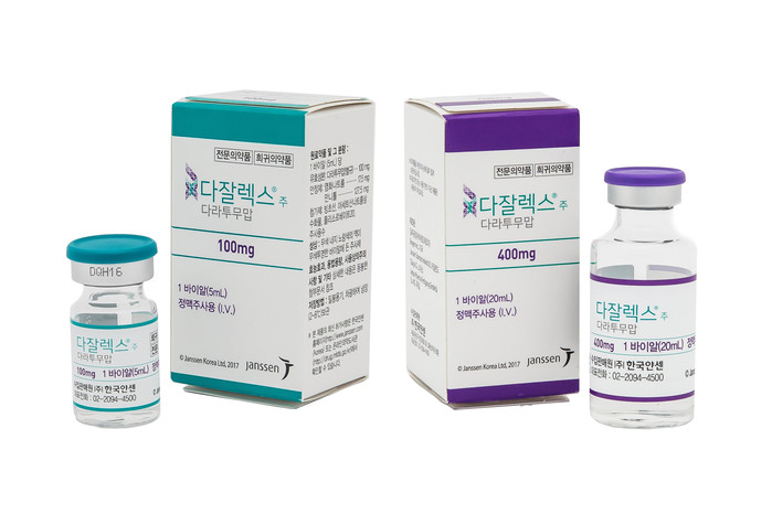 | ▲다잘렉스® (왼쪽) 100mg/5ml | (오른쪽) 400mg/20ml (Darzalex, 성분명 다라투무맙) |