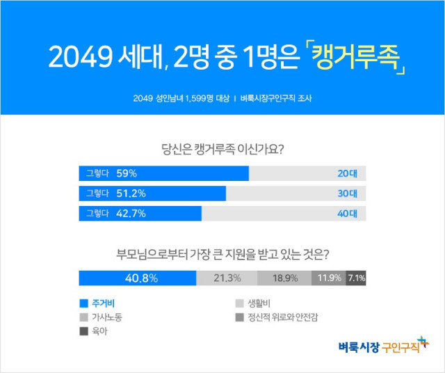 벼룩시장구인구직(20~40대 성인남녀 1599명 대상)의 조사에 따르면, 응답자의 51.3%가 본인은 ‘캥거루족’이라고 생각한다고 답변했다. 캥거루족은 성인이 됐음에도 부모에게 경제적‧정신적으로 의존하는 이들을 의미한다.