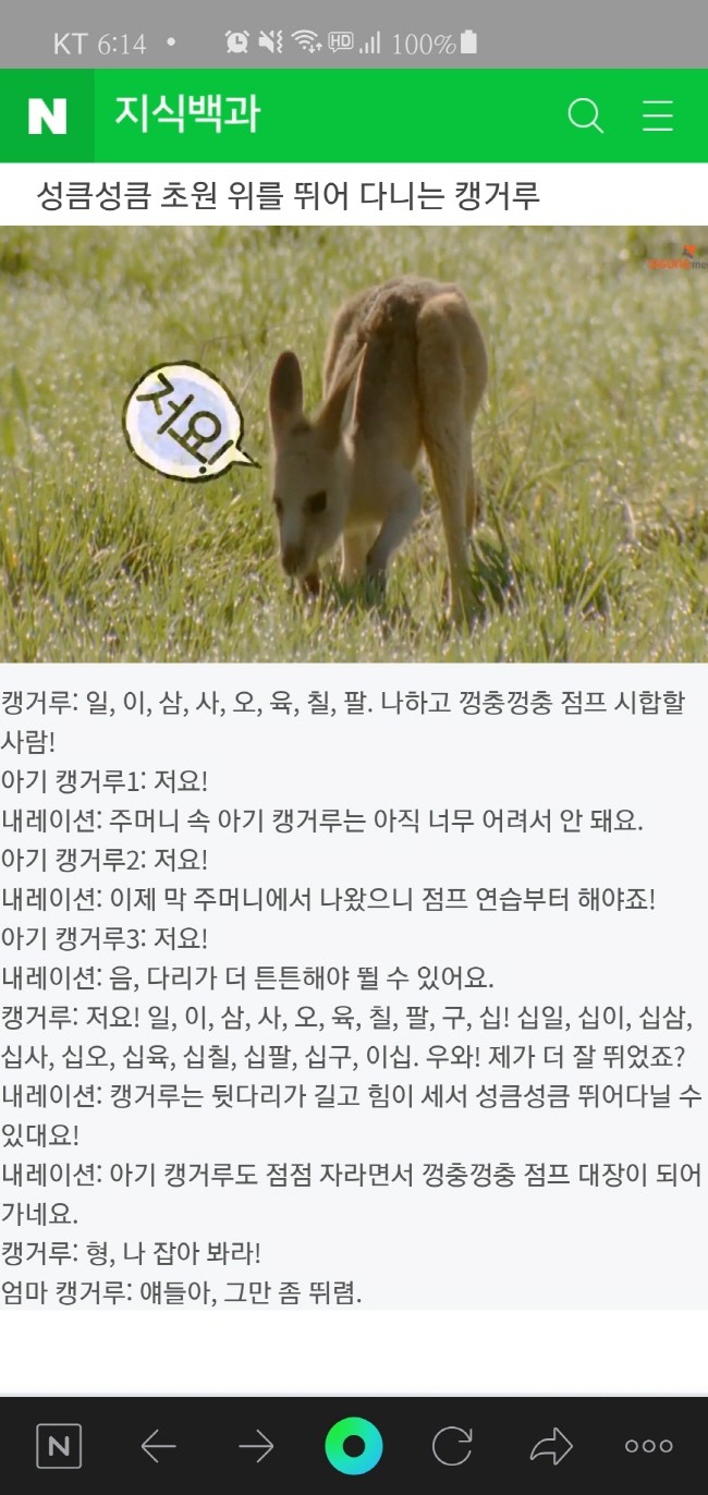 천재학습백과에 따르면, 캥거루는 충분히 자라지 못하고 나은 새끼를 보호하기 위해 30~40일 아기 주머니에서 키우며 젖을 먹이지만, 새끼가 완전히 자라고 나면 혼자서 잘 성장할 수 있도록 점프 연습을 시킨다.