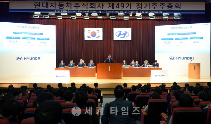17일 오전 서울 양재동 현대자동차 본사에서 열린 제49기 정기 주주총회에서 이원희 대표이사가 안건을 처리하고 있다. 이날 주주총회에서는 정몽구 회장을 3년 임기의 사내이사로 재선임하는 안건을 상정하고 통과시켰다. 2017.03.17.