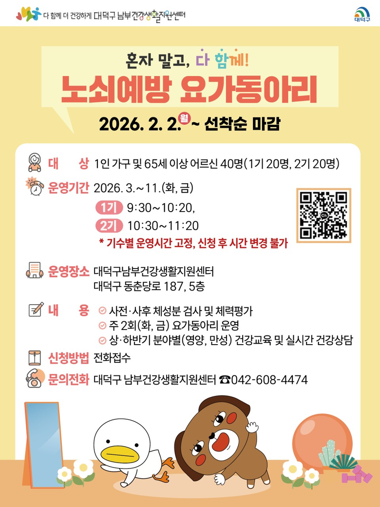 자세한 사항은 대덕구 남부건강생활지원센터(☏042-608-4474)로 문의하면 된다.