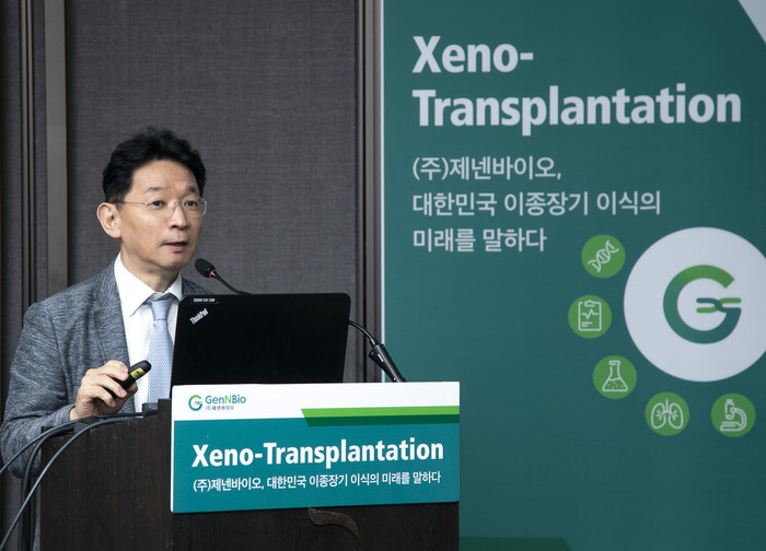 | ▲㈜제넨바이오 주최 ‘Xeno-transplantation(이종이식)’ 기자간담회에서 바이오이종장기개발사업단 박정규 단장이 발표하고 있다. |