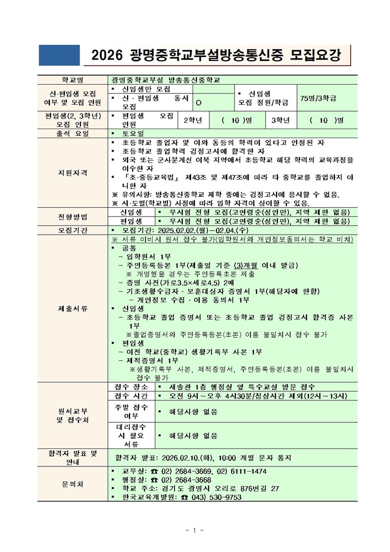 ◦ 신입생 및 편입생 모집은 2026년 2월 2일(월)부터 2월 4일(수)까지 [광명시 세계타임즈=송민수 기자] 광명중학교 부설 방송통신중학교(교장 신동훈)는 2026학년도 신입생 및 편입생 모집을 2026년 2월 2일(월)부터 2월 4일(수)까지 진행한다.