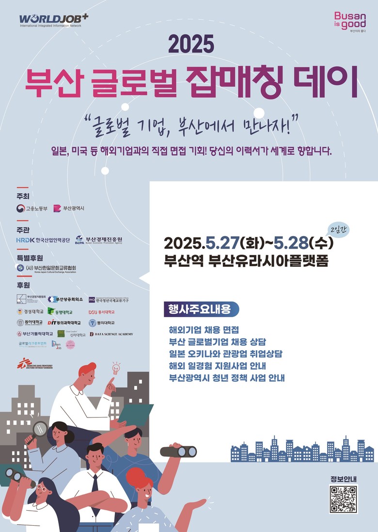 ◈ 해외 취업에 관심 있는 청년이면 누구나 행사 당일 현장 접수를 통해 참여할 수 있어 [부산 세계타임즈=이용우 기자] 부산시(시장 박형준)는 오늘(27일)과 내일(28일) 양일간 부산유라시아플랫폼에서 「2025 부산 글로벌 잡매칭데이」를 개최한다고 밝혔다.