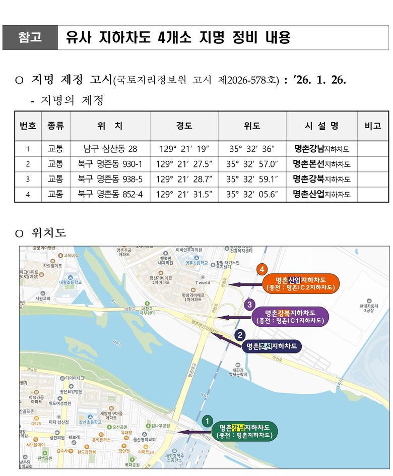 정비된 지하차도 4곳의 명칭은 지난 26일 실시된 국토지리정보원의 지명 제정 고시를 거쳐 국가기본도에 반영될 예정이다.