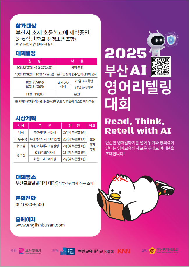 ◈ 예선 2차를 통과한 10명이 11.1. 부산글로벌빌리지 대강당에서 본선을 치르며, 대상은 부산시장 상장 수여… 자세한 사항은 누리집(englishbusan.com) 참고 [부산 세계타임즈=이용우 기자] 부산시(시장 박형준)는 인공지능(AI)과 리텔링(Retelling)*을 결합한 차별화된 영어 말하기 대회인「2025 부산 인공지능(AI) 영어 리텔링 대회」를 개최한다고 밝혔다.