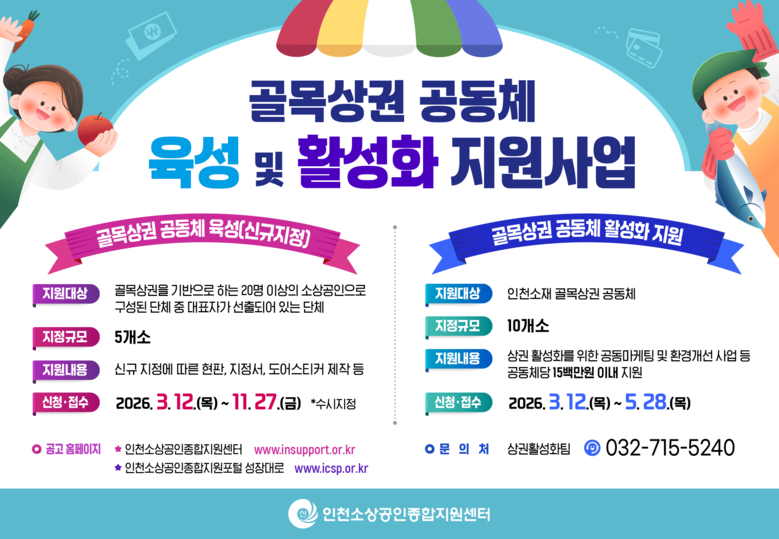 사업 신청은 ‘공동체 육성’의 경우 3월 12일부터 11월 27일까지,‘공동체 활성화’사업은 3월 12일부터 5월 28일까지 접수하며 인천소상공인종합지원센터에 직접 방문해 신청할 수 있다.