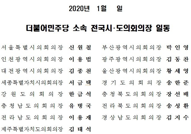 더불어민주당 소속 시도의회 의장들은 지난 8일 울산에서 열린 전국시도의회의장협의회 총회에서 이 같은 뜻을 모으고 성명서 채택을 결의했다.