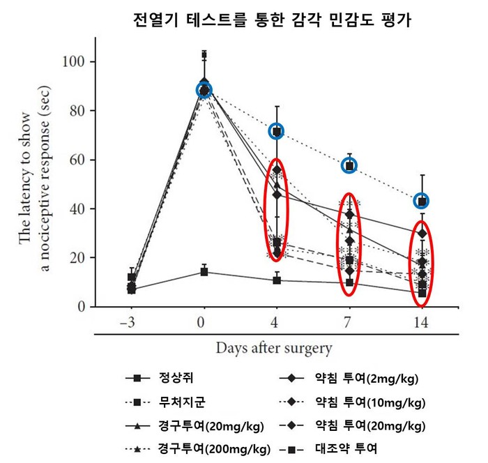 | ▲그림에 따르면 척추관협착증을 유도한 쥐에 '신바로2'를 투여하면 연구일이 거듭될수록 온각자극에 반응하는 시간이 빨라짐을 알 수 있다. |