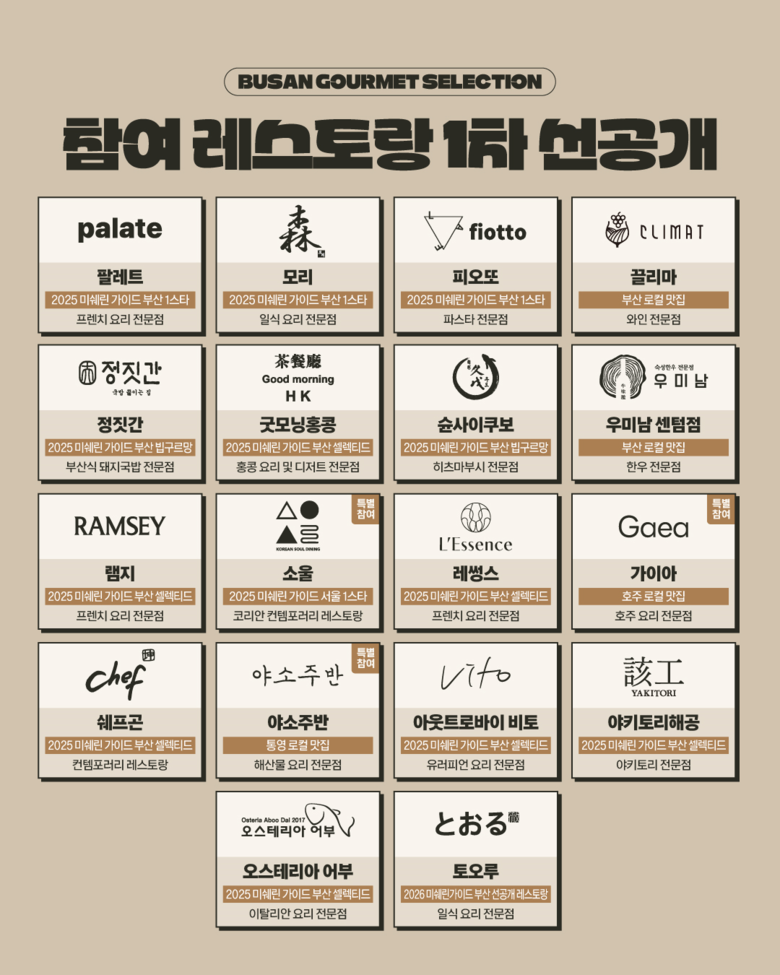 행사에는 총 30여 곳의 식당이 참여하며, 1차로 미쉐린 가이드 부산 선정 식당 13곳, 지역 식당 등 5곳이 함께한다.
